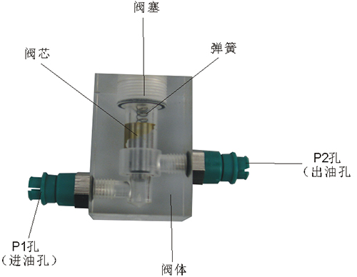 2、液控單向閥結(jié)構(gòu)上參考了國產(chǎn)IY-25B型液壓單向閥,其閥體、螺塞等采用了進(jìn)口透明有機(jī)玻璃材料精制而成,閥芯、頂桿采用了45#中碳鋼材料,并配合彈簧,油接頭,密封圈等標(biāo)準(zhǔn)件裝配而成,通過它可明確地觀察到活塞、彈簧、油孔等結(jié)構(gòu)及其運(yùn)行過程,具有形象逼真,性能可靠等優(yōu)點(diǎn)。它即可作為教學(xué)模型,也可以作為液壓實(shí)驗(yàn)元件進(jìn)行實(shí)驗(yàn)演示。