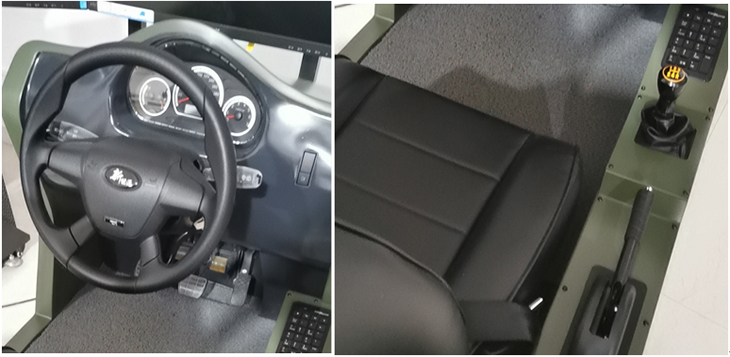 2)開放式艙體,方向盤、變速機(jī)構(gòu)、手制動(dòng)、加油踏板、制動(dòng)踏板、離合器踏板等實(shí)裝主要操作部件均需要模擬,其外觀尺寸、部署相對(duì)位置、操作行程,以及操作力度感受與實(shí)際基本一致,操縱機(jī)件性能工作可靠、操作靈活、低噪音。